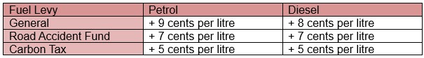 The customs and excise levies on fuel remain unchanged but fuel levies have increased, with the general, Road Accident Fund and carbon tax levies up for both petrol and diesel from 1 April.