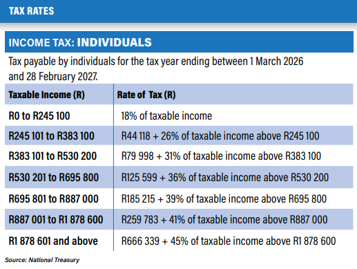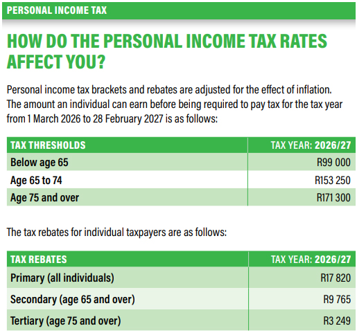 The tax threshold for individuals below age 65 is now R99 000, and medical tax credits will increase from R364 to R376 for the first two members, and from R246 to R254 for additional members.