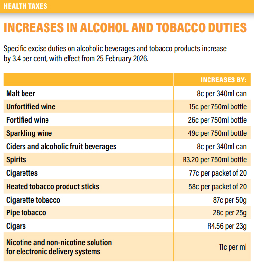 The corporate tax rate remains unchanged at 27%. The global minimum tax rules will be implemented in 2026/27, a move expected to raise around R2 billion (down from an earlier estimate of R8 billion) by reducing profit shifting by multinationals.